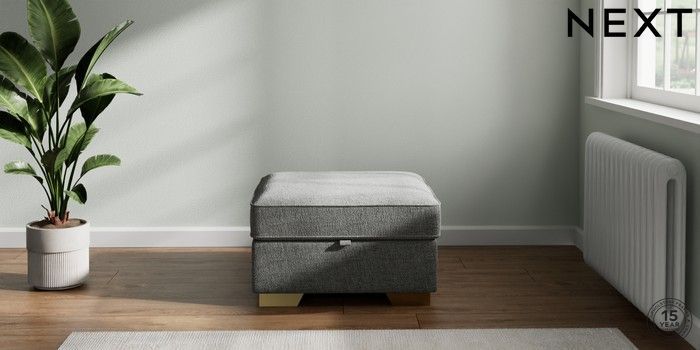 7.2.10 Buy Stamford Buttoned Back Storage Footstool Chunky Chenille Dark Grey Square Angle - Brushed Brass from the Laura Ashley online shop Click here to use our website with more accessibility support, for example screen readers