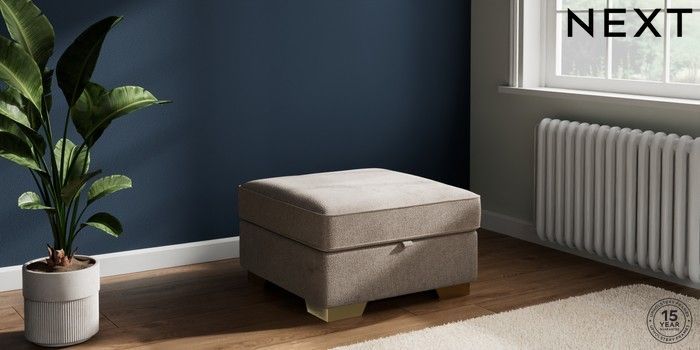 7.2.10 Buy Stamford Buttoned Back Storage Footstool Chunky Chenille Light Dove Square Angle - Brushed Brass from the Laura Ashley online shop Click here to use our website with more accessibility support, for example screen readers
