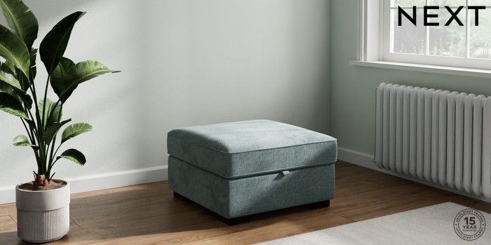 7.2.10 Buy Stamford Buttoned Back Storage Footstool Chunky Chenille Light Teal Green Square Angle - Dark from the Laura Ashley online shop Click here to use our website with more accessibility support, for example screen readers