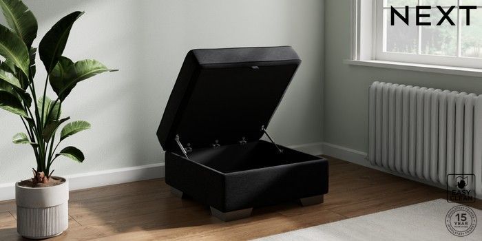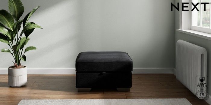 7.2.6 Buy Stamford Buttoned Back Storage Footstool Fine Chenille Easy Clean Black Square Angle - Gunmetal from the Laura Ashley online shop Click here to use our website with more accessibility support, for example screen readers