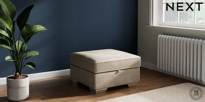7.2.6 Buy Stamford Buttoned Back Storage Footstool Plush Chenille Light Natural Square Angle - Chrome Metal from the Laura Ashley online shop Click here to use our website with more accessibility support, for example screen readers