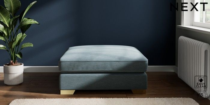 7.2.6 Buy Stamford Grand Relaxed Sit Extra Large Footstool Fine Chenille Easy Clean Mid Blue Square Angle - Brushed Brass from the Laura Ashley online shop Click here to use our website with more accessibility support, for example screen readers