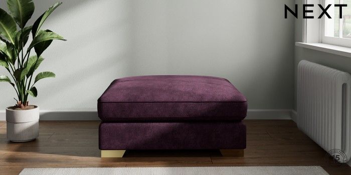 7.2.6 Buy Stamford Grand Relaxed Sit Extra Large Footstool Plush Chenille Dark Plum Purple Square Angle - Brushed Brass from the Laura Ashley online shop Click here to use our website with more accessibility support, for example screen readers