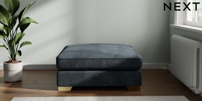 7.2.6 Buy Stamford Grand Relaxed Sit Extra Large Footstool Plush Chenille Slate Blue Square Angle - Brushed Brass from the Laura Ashley online shop Click here to use our website with more accessibility support, for example screen readers