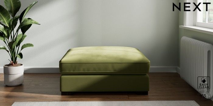 7.2.6 Buy Stamford Grand Relaxed Sit Extra Large Footstool Plush Velvet Easy Clean Mid Olive Green Square Angle - Dark from the Laura Ashley online shop Click here to use our website with more accessibility support, for example screen readers