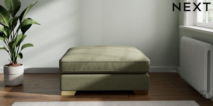 7.2.6 Buy Stamford Grand Relaxed Sit Extra Large Footstool Tweedy Chenille Mid Moss Green Square Angle - Brushed Brass from the Laura Ashley online shop Click here to use our website with more accessibility support, for example screen readers
