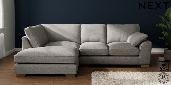 7.3.1 Buy Stamford Grand Relaxed Sit Medium Corner Chaise - Left Hand Woven Chenille Easy Clean Light Grey Large Square Angle - Brushed Brass from the Laura Ashley online shop