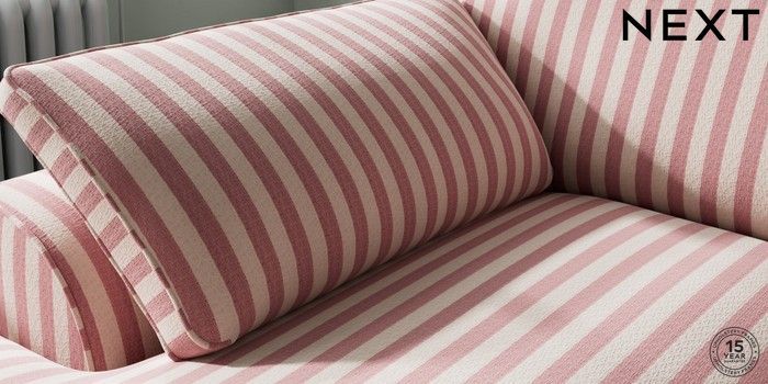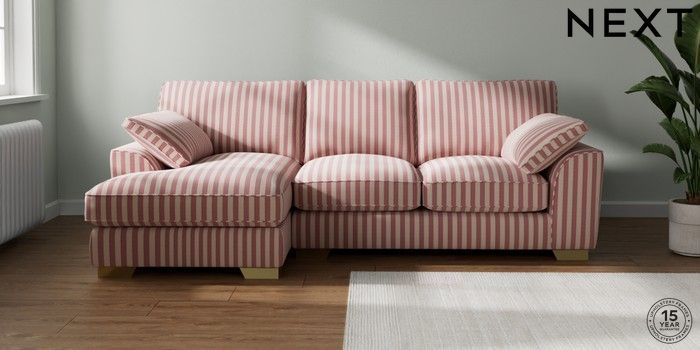 7.3.1 Buy Stamford Grand Relaxed Sit Medium Sofa Chaise - Left Hand Bold Chenille Stripe Dark Pink Large Square Angle - Brushed Brass from the Laura Ashley online shop Click here to use our website with more accessibility support, for example screen readers