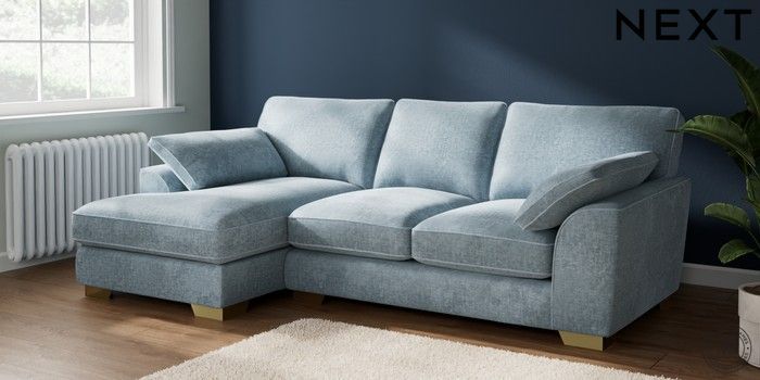 7.2.6 Buy Stamford Grand Relaxed Sit Medium Sofa Chaise - Left Hand Plush Chenille Light Blue Large Square Angle - Brushed Brass from the Laura Ashley online shop Click here to use our website with more accessibility support, for example screen readers