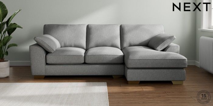 7.3.1 Buy Stamford Grand Relaxed Sit Medium Sofa Chaise - Right Hand Chunky Weave Mid Grey Large Square Angle - Brushed Brass from the Laura Ashley online shop
