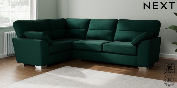 7.2.6 Buy Stamford Highback Large Corner Sofa - Left Hand Plush Velvet Easy Clean Bottle Green Large Square Angle - Chrome Metal from the Laura Ashley online shop Click here to use our website with more accessibility support, for example screen readers