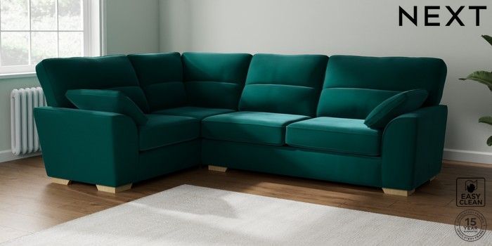 7.2.6 Buy Stamford Highback Large Corner Sofa - Left Hand Plush Velvet Easy Clean Juniper Green Large Square Angle - Light from the Laura Ashley online shop Click here to use our website with more accessibility support, for example screen readers