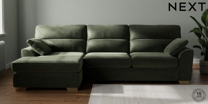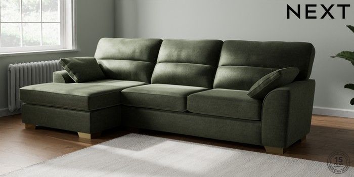 7.2.6 Buy Stamford Highback Large Sofa Chaise - Left Hand Luxe Chenille Mid Green Large Square Angle - Brushed Brass from the Laura Ashley online shop Click here to use our website with more accessibility support, for example screen readers