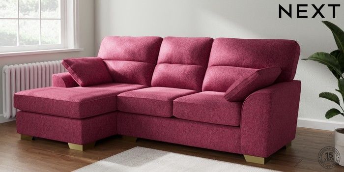 7.2.6 Buy Stamford Highback Medium Sofa Chaise - Left Hand Cotswold Chenille Dark Raspberry Pink Large Square Angle - Brushed Brass from the Laura Ashley online shop Click here to use our website with more accessibility support, for example screen readers