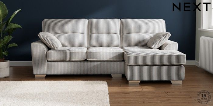 7.3.1 Buy Stamford Highback Medium Sofa Chaise - Right Hand Chenille Stripe Slate Blue Large Square Angle - Chrome Metal from the Laura Ashley online shop Click here to use our website with more accessibility support, for example screen readers