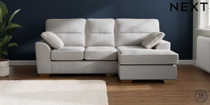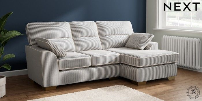 7.3.1 Buy Stamford Highback Small Sofa Chaise - Right Hand Chenille Stripe Slate Blue Large Square Angle - Brushed Brass from the Laura Ashley online shop Click here to use our website with more accessibility support, for example screen readers