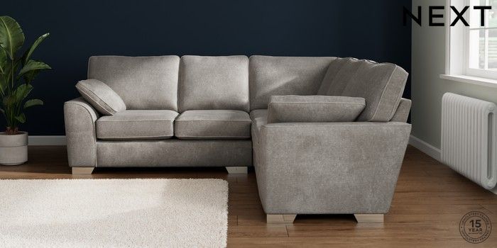 7.2.10 Buy Stamford Medium Corner Sofa - Universal Plush Chenille Light Grey Large Square Angle - Chrome Metal from the Laura Ashley online shop Click here to use our website with more accessibility support, for example screen readers