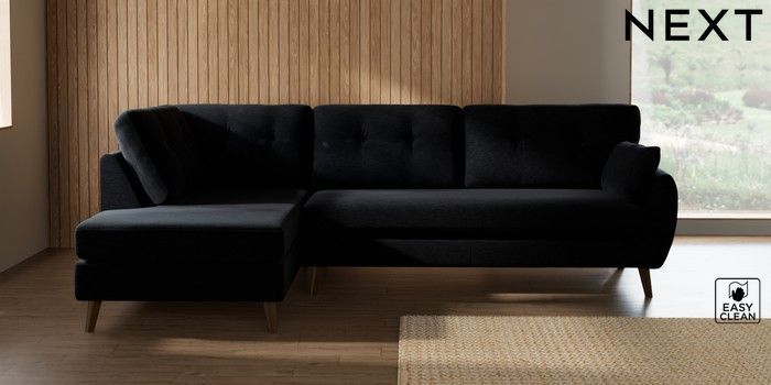 7.3.1 Buy Wilson Buttoned Back Large Corner Chaise - Left Hand Fine Chenille Easy Clean Black Retro Tapered - Mid from the Laura Ashley online shop