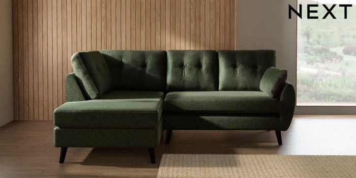 7.3.1 Buy Wilson Buttoned Back Medium Corner Chaise - Left Hand Boucle Chenille Dark Moss Green Retro Tapered - Dark from the Laura Ashley online shop