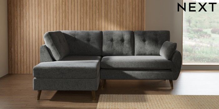 7.3.1 Buy Wilson Buttoned Back Medium Corner Chaise - Left Hand Chunky Chenille Dark Grey Low Retro Tapered Metal Cap - Mid from the Laura Ashley online shop Click here to use our website with more accessibility support, for example screen readers