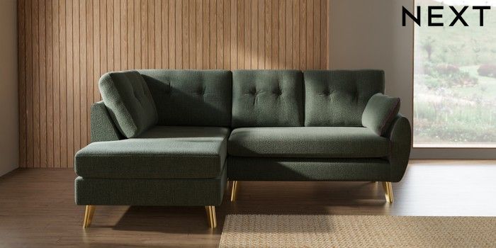 7.3.1 Buy Wilson Buttoned Back Medium Corner Chaise - Left Hand Chunky Texture Mid Forest Green Metal Tapered - Gold from the Laura Ashley online shop Click here to use our website with more accessibility support, for example screen readers