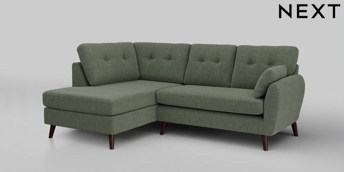 6.12.1 Buy Wilson Buttoned Back Medium Corner Chaise - Left Hand Chunky Texture Mid Forest Green Retro Tapered - Dark Brown from the Laura Ashley online shop Click here to use our website with more accessibility support, for example screen readers