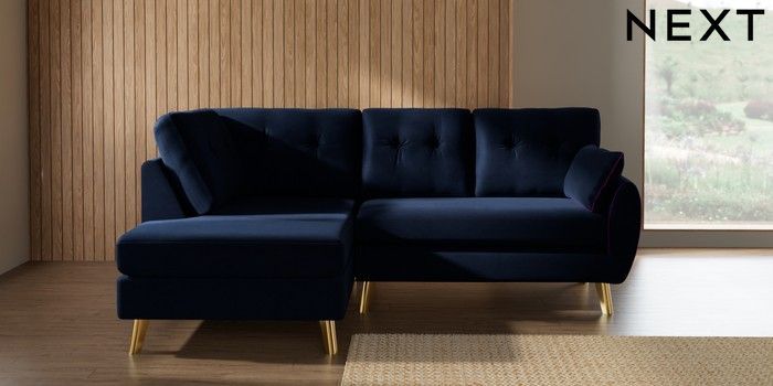 7.3.1 Buy Wilson Buttoned Back Medium Corner Chaise - Left Hand Luxe Chenille Navy Blue Metal Tapered - Gold from the Laura Ashley online shop