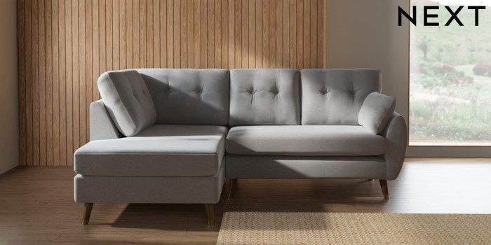 7.3.1 Buy Wilson Buttoned Back Medium Corner Chaise - Left Hand Natural Mix Light Grey Low Retro Tapered Metal Cap - Mid from the Laura Ashley online shop Click here to use our website with more accessibility support, for example screen readers
