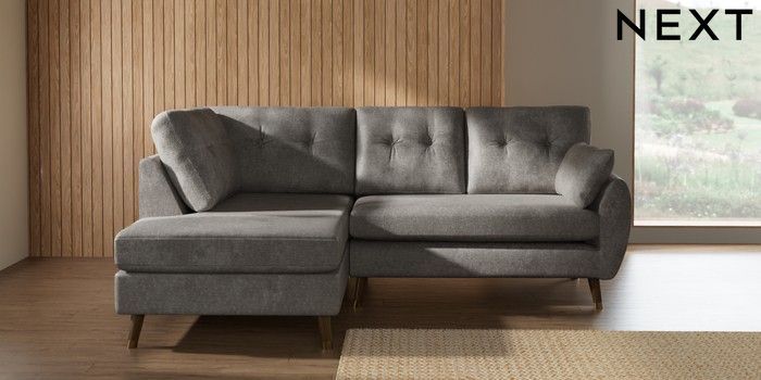 7.3.1 Buy Wilson Buttoned Back Medium Corner Chaise - Left Hand Plush Chenille Light Grey Low Retro Tapered Metal Cap - Mid from the Laura Ashley online shop