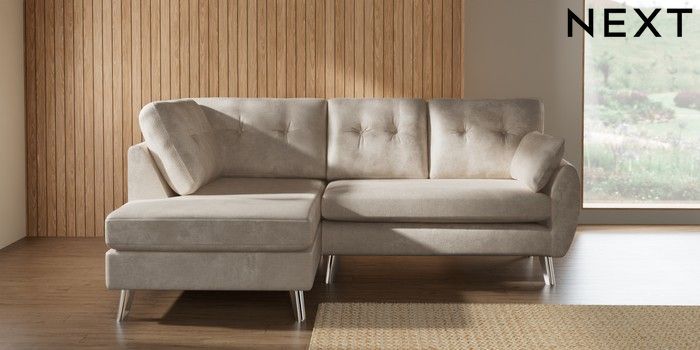 7.3.1 Buy Wilson Buttoned Back Medium Corner Chaise - Left Hand Plush Chenille Oyster Metal Tapered - Chrome from the Laura Ashley online shop Click here to use our website with more accessibility support, for example screen readers