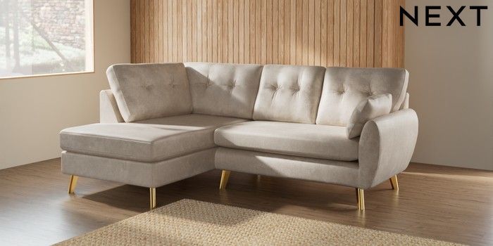 7.2.10 Buy Wilson Buttoned Back Medium Corner Chaise - Left Hand Plush Chenille Oyster Metal Tapered - Gold from the Laura Ashley online shop Click here to use our website with more accessibility support, for example screen readers