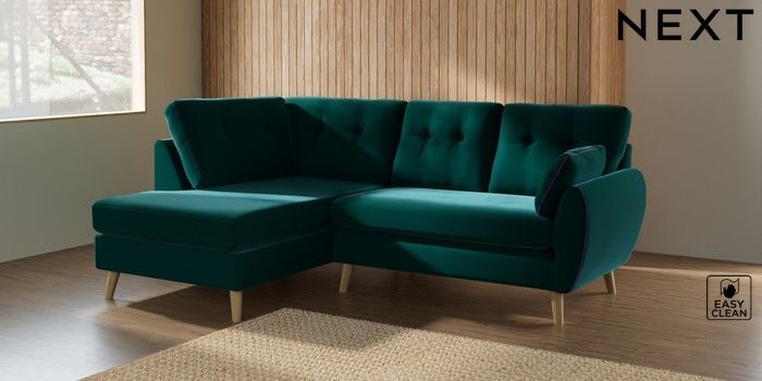 7.2.10 Buy Wilson Buttoned Back Medium Corner Chaise - Left Hand Plush Velvet Easy Clean Juniper Green Retro Tapered - Light from the Laura Ashley online shop Click here to use our website with more accessibility support, for example screen readers