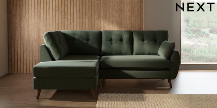 7.3.1 Buy Wilson Buttoned Back Medium Corner Chaise - Left Hand Relaxed Linen Look Dark Green Retro Tapered - Mid from the Laura Ashley online shop Click here to use our website with more accessibility support, for example screen readers