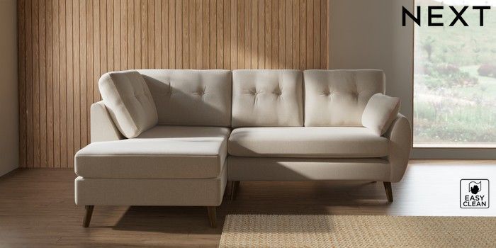 7.3.1 Buy Wilson Buttoned Back Medium Corner Chaise - Left Hand Tweedy Blend Easy Clean Oyster Retro Tapered - Mid from the Laura Ashley online shop Click here to use our website with more accessibility support, for example screen readers