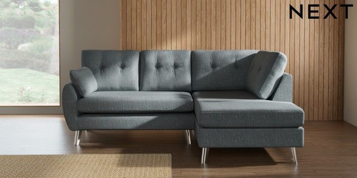 7.3.1 Buy Wilson Buttoned Back Medium Corner Chaise - Right Hand Chunky Weave Mid Blue Metal Tapered - Chrome from the Laura Ashley online shop Click here to use our website with more accessibility support, for example screen readers