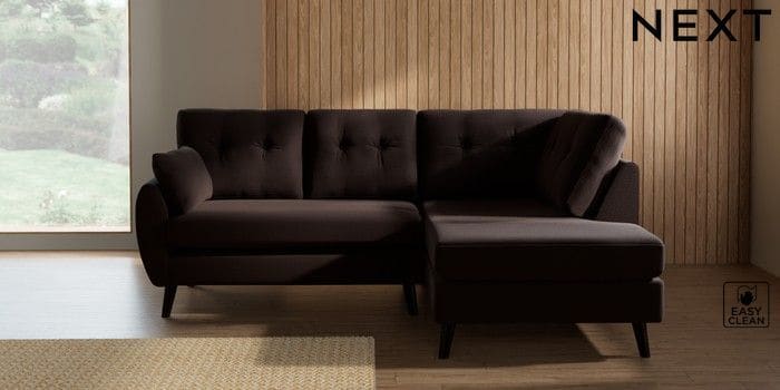7.3.1 Buy Wilson Buttoned Back Medium Corner Chaise - Right Hand Fine Chenille Easy Clean Chocolate Brown Retro Tapered - Dark from the Laura Ashley online shop Click here to use our website with more accessibility support, for example screen readers