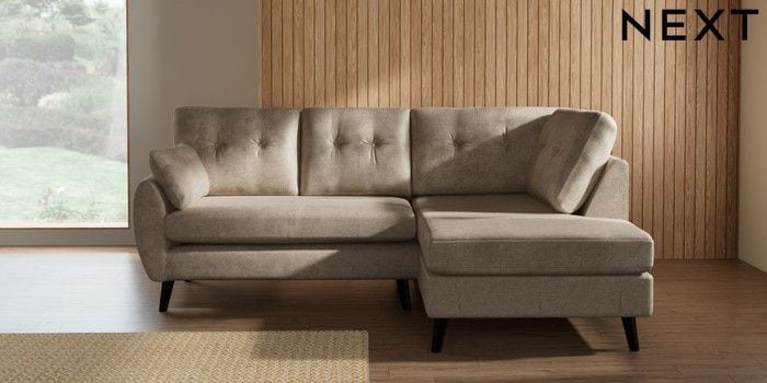 7.3.1 Buy Wilson Buttoned Back Medium Corner Chaise - Right Hand Plush Chenille Light Natural Retro Tapered - Dark from the Laura Ashley online shop