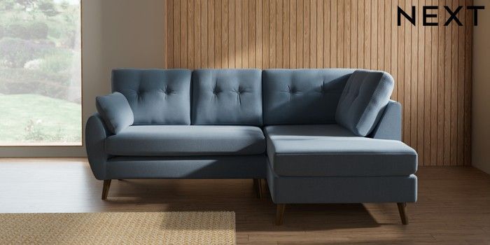 7.3.1 Buy Wilson Buttoned Back Medium Corner Chaise - Right Hand Relaxed Linen Look Mid Blue Retro Tapered - Mid from the Laura Ashley online shop Click here to use our website with more accessibility support, for example screen readers