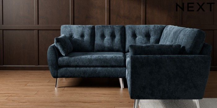 7.3.1 Buy Wilson Buttoned Back Small Corner Sofa - Universal Distressed Velour Midnight Blue Metal Tapered - Chrome from the Laura Ashley online shop Click here to use our website with more accessibility support, for example screen readers
