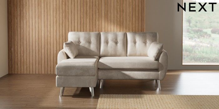 7.3.1 Buy Wilson Buttoned Back Small Sofa Chaise - Left Hand Plush Chenille Oyster Metal Tapered - Chrome from the Laura Ashley online shop Click here to use our website with more accessibility support, for example screen readers