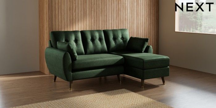 7.2.10 Buy Wilson Buttoned Back Small Sofa Chaise - Right Hand Luxe Chenille Dark Green Low Retro Tapered Metal Cap - Mid from the Laura Ashley online shop Click here to use our website with more accessibility support, for example screen readers