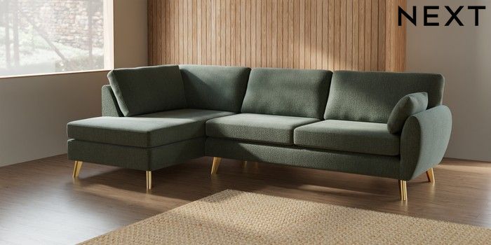 7.3.1 Buy Wilson Large Corner Chaise - Left Hand Chunky Texture Mid Forest Green Metal Tapered - Gold from the Laura Ashley online shop