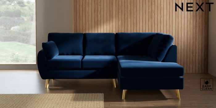 7.3.1 Buy Wilson Medium Corner Chaise - Right Hand Plush Velvet Easy Clean Navy Blue Metal Tapered - Gold from the Laura Ashley online shop