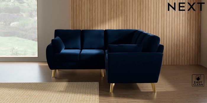 7.3.1 Buy Wilson Small Corner Sofa - Universal Plush Velvet Easy Clean Navy Blue Metal Tapered - Gold from the Laura Ashley online shop