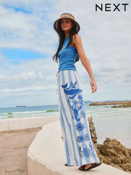Blue/White Nautical Stripe Linen Blend Wide Leg Trousers