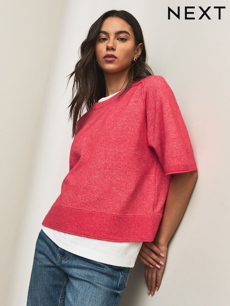 Bright Pink Knitted Short Sleeve Jumper With Wool