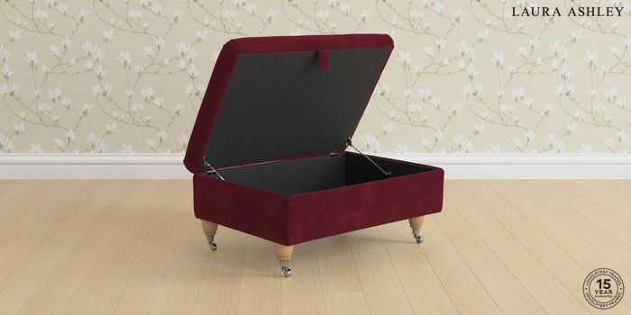 7.3.1 Buy Ambersham by Laura Ashley Storage Footstool Alwyn Velvet Burgundy Red Low Chrome Castor - Light Oak from the Seasons online shop Click here to use our website with more accessibility support, for example screen readers