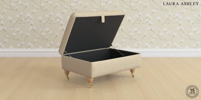 7.3.1 Buy Ambersham by Laura Ashley Storage Footstool Birchgrove Check Oatmeal Natural Low Brass Castor - Light Oak from the Seasons online shop Click here to use our website with more accessibility support, for example screen readers