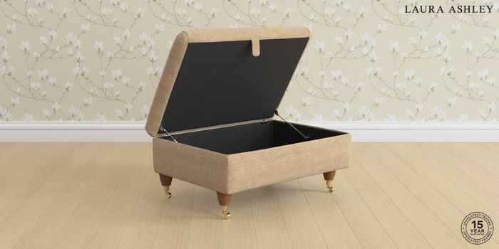 7.3.1 Buy Ambersham by Laura Ashley Storage Footstool Edwin Chenille Gold Natural Low Brass Castor - Teak from the Seasons online shop Click here to use our website with more accessibility support, for example screen readers