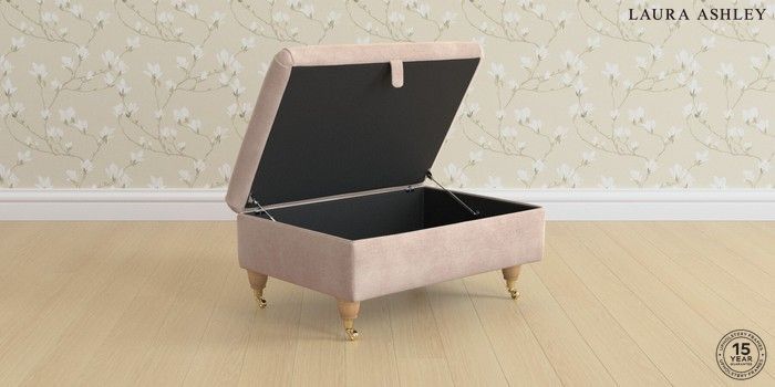 7.3.1 Buy Ambersham by Laura Ashley Storage Footstool Orla Chalk Pink Low Brass Castor - Light Oak from the Seasons online shop Click here to use our website with more accessibility support, for example screen readers